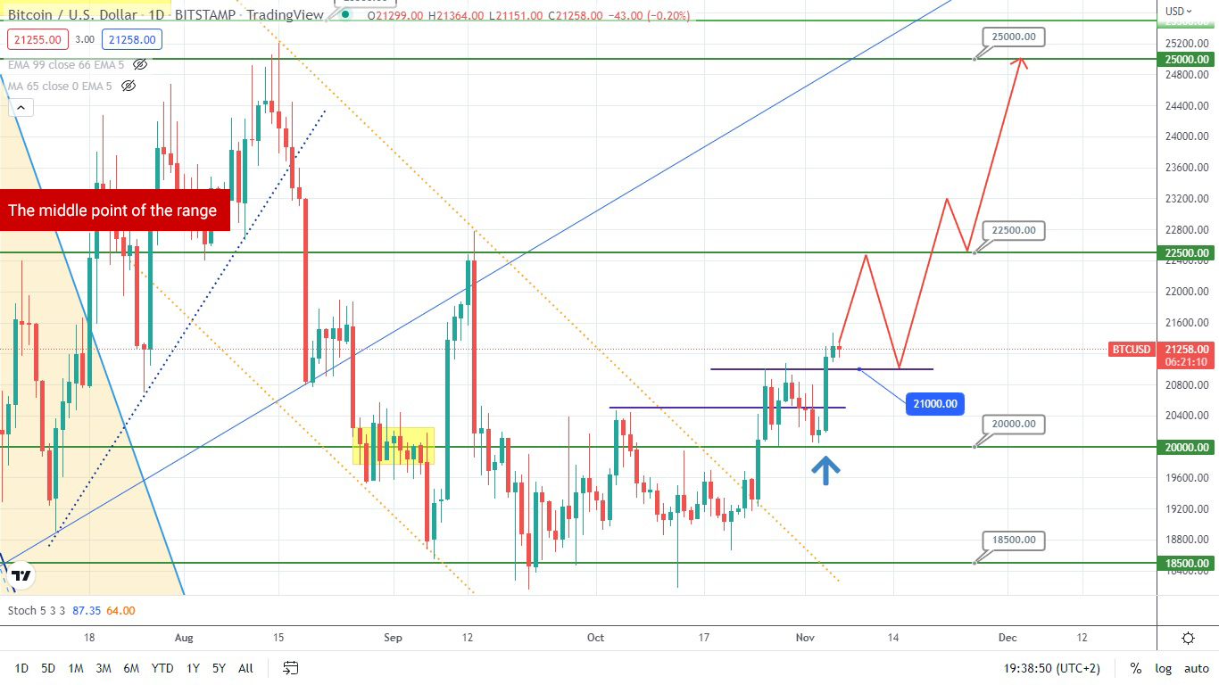 Bitcoin broke the level of 21000. Currently, the asset is consolidating. Bitcoin is likely to pull away from the broken level of 21000 and target the level of 22500 next.