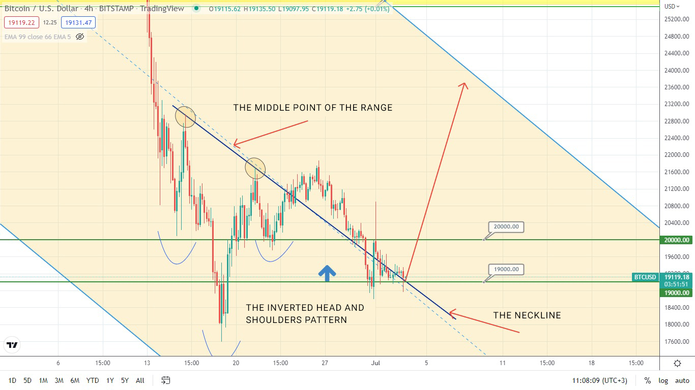 Bitcoin keeps moving along the broken neckline of the inverted head and shoulders pattern. Currently, the asset is testing the supporting level of 19000. Bitcoin is likely to undergo correction soon. Of course, it can also slightly drop and gain the required support at the level of 18000.
