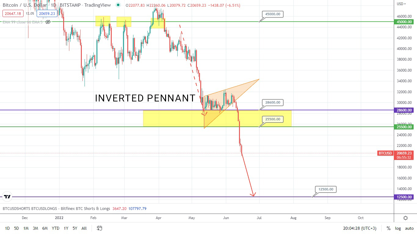 Bitcoin broke the supporting level of 25500, confirming the formation of a pennant. Now, Bitcoin can safely target the level of 12500. The asset will likely keep going down until the market players regain their interest in this cryptocurrency.