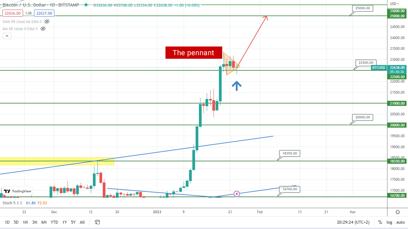 The price of Bitcoin remains at the broken level of 22000, trying to form a small spinning white candle. Given the previous formation of a long white candle, it is safe to assume that the pennant formation is about to happen soon. Bitcoin might potentially have to face resistance at the level of 25000.