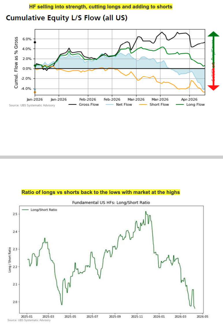 Hedge funds were not the only source of supply. UBS retail flows also recorded their largest weekly outflows of the year, with selling heavily concentrated in semiconductors. More broadly, aggregate discretionary manager positioning still points to only a modest overweight in equities, rather than an aggressively extended long.