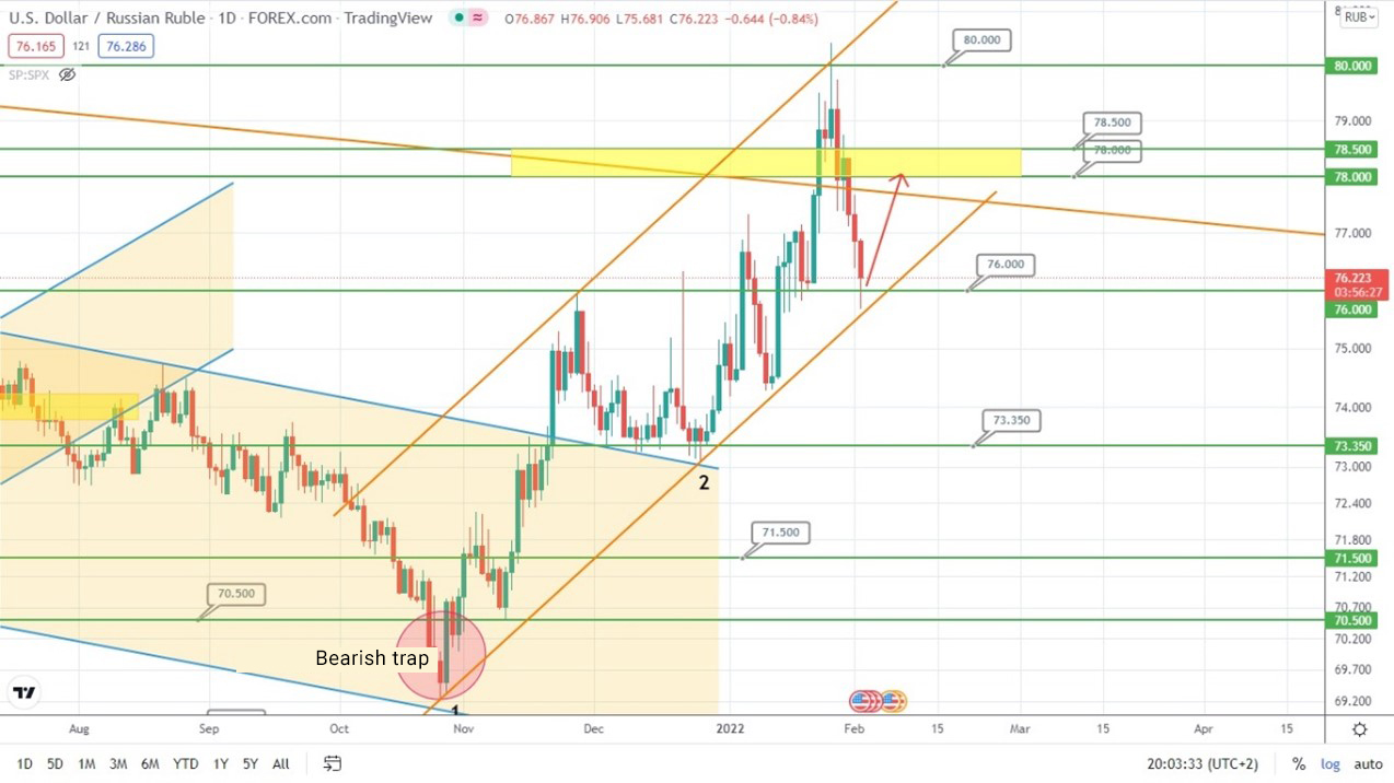 The price of Russian ruble has touched the level of 76.00 and uptrend. The asset is likely to pull from this level and target the level of 78.00. So, it is worth observing what is going to happen next.