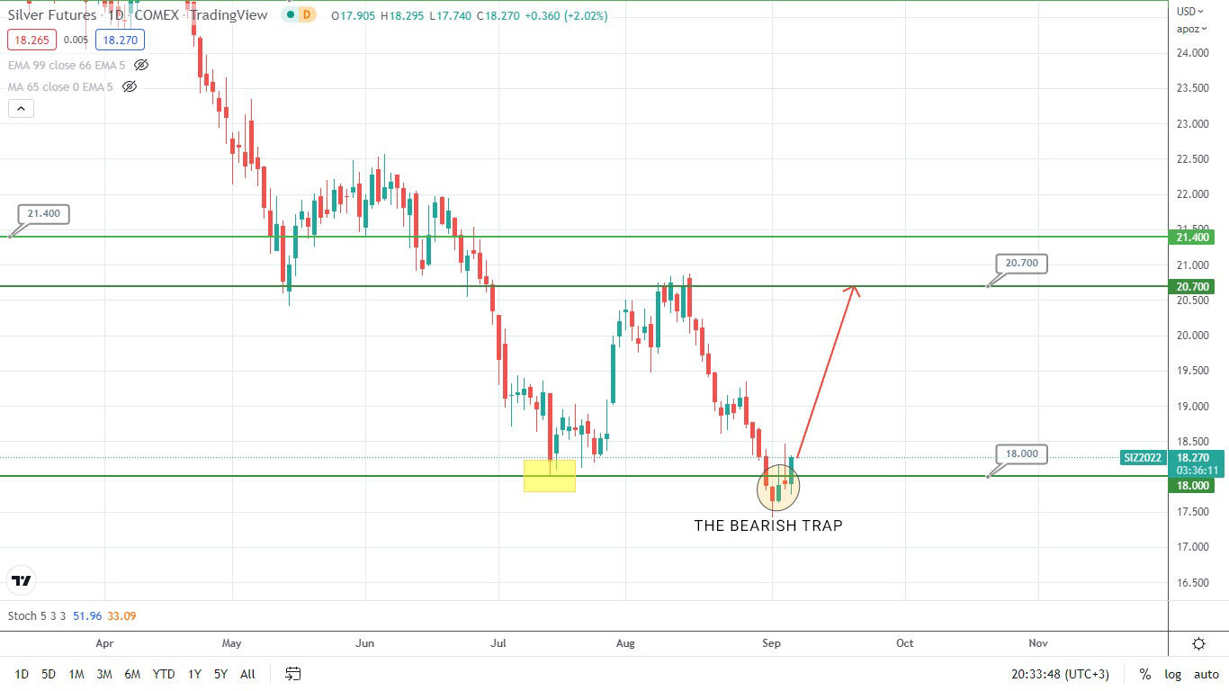 Having formed the bearish trap at the psychological supporting level of 18.00, silver is trying to close the trading day with a white candle. It could potentially mean that silver might head North and target the level of 20.00 next.