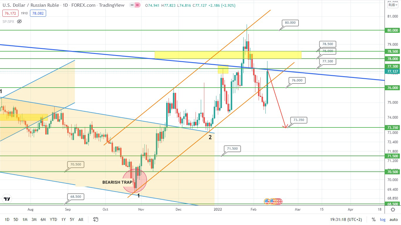 Russian ruble has pulled back to the level of 77.30, although the weekly uptrend, which underwent the false breakout some time ago, plays a more important role here. The USD/RUB pair might undergo correction and drop till the level of 72 soon.