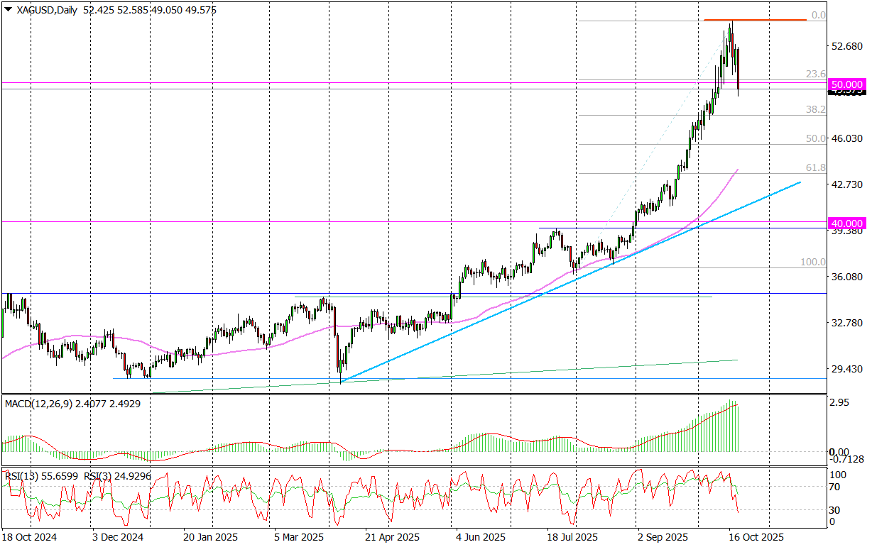 Utrzymujące się duże wykupienie na wykresie dziennym srebra wreszcie dało o sobie znać. Rozpoczęta w ostatni piątek realizacja zysków dziś znacząco przybrała na sile. Kurs srebra spadł poniżej 50 USD z 52,391 USD wczoraj na koniec dnia i wobec piątkowego rekordu na poziomie 54,453 USD.