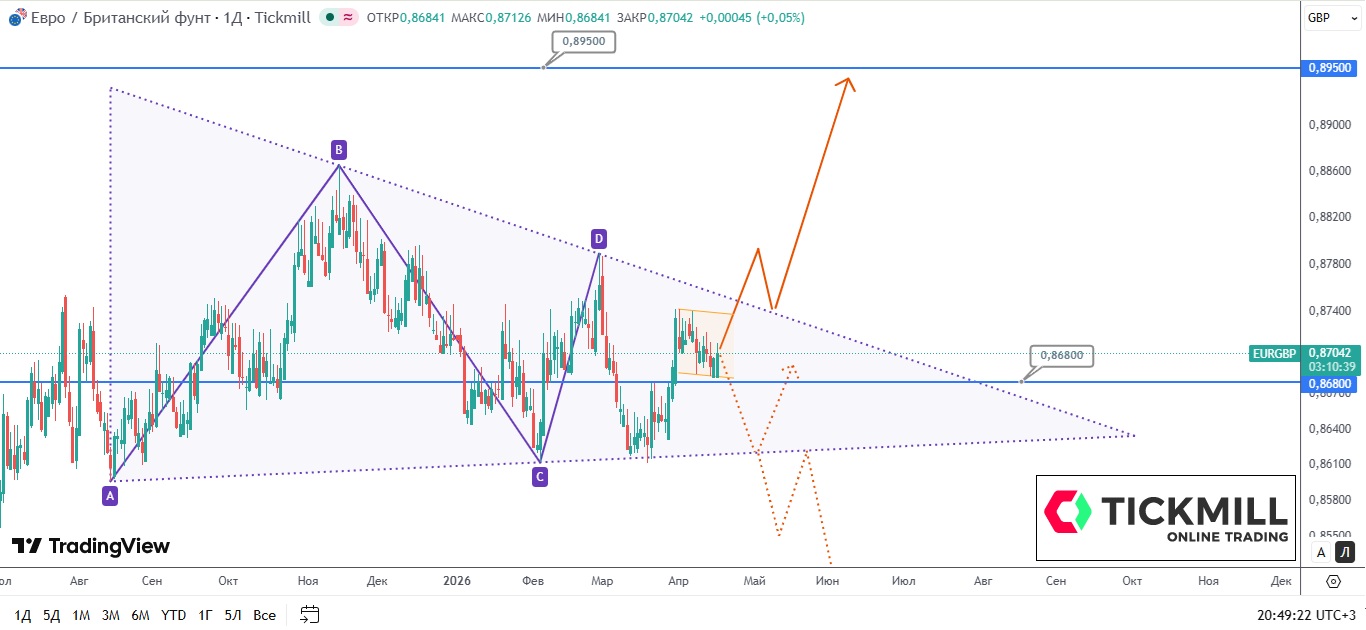 Если бычий импульс подтвердится пробоем границы фигуры, мы увидим реализацию сценария с выходом из зоны накопления. Характер взаимодействия цены с верхней гранью треугольника станет ключевым индикатором готовности рынка к масштабному движению.